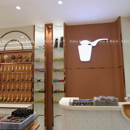 A luxurious Oudh shop interior featuring warm ambient lighting, elegant display shelves, gold-accented wall panels, and refined seating, creating a rich, inviting, and premium retail experience.